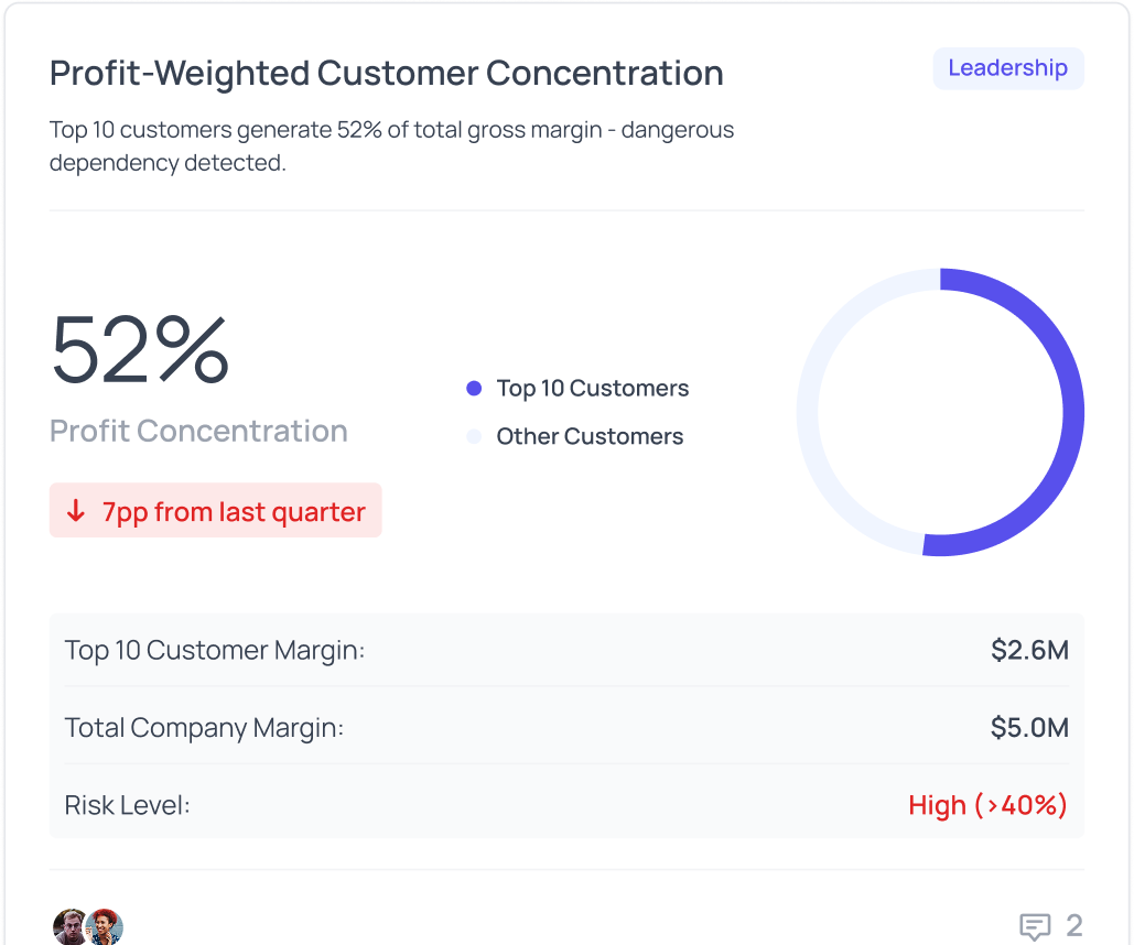 When too much revenue depends on too few customers, your business is vulnerable. We monitor your customer concentration and alert you when dependency on any single account exceeds healthy thresholds.