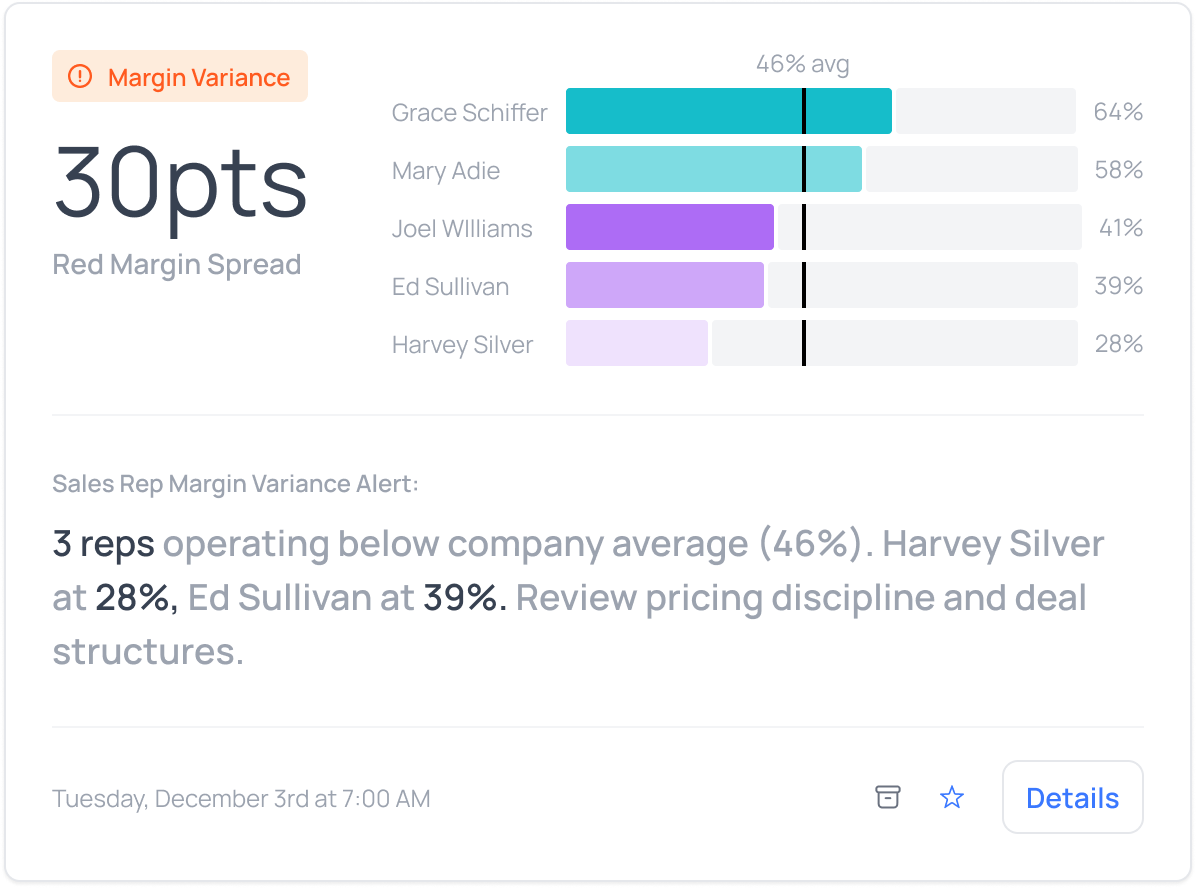 Your sales team's performance varies more than you think. We identify outliers (both high performers worth learning from and underperformers who may need support) across key metrics like average order size and customer retention.