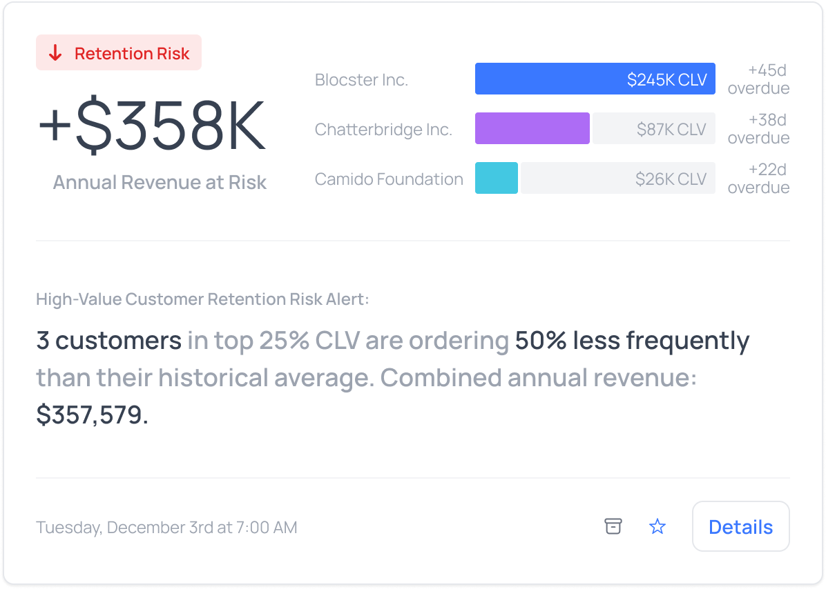 Your best customers deserve the most attention, especially when something's wrong. We flag high-value accounts showing early warning signs of churn: declining order frequency, shrinking order sizes, or lengthening purchase gaps.