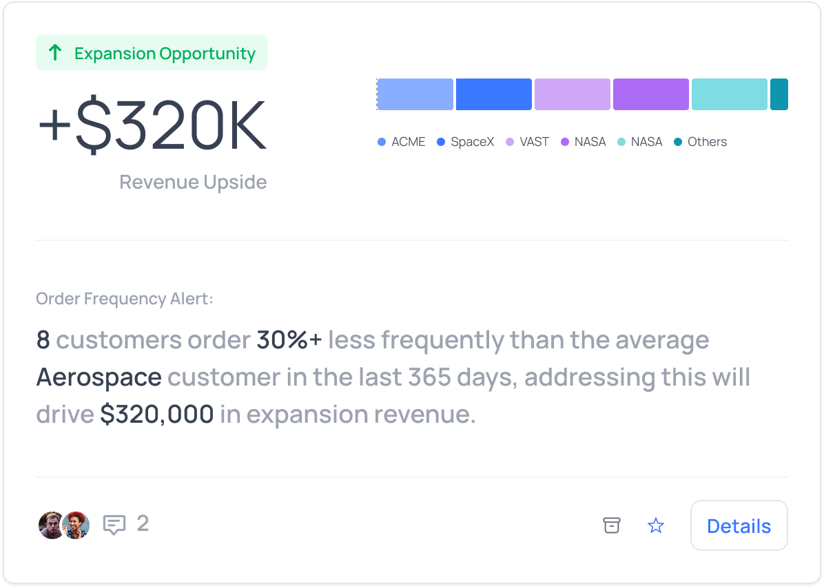 Retaining a top customer is 5-10x more valuable than acquiring a new one. Early intervention can save relationships before they're lost.
