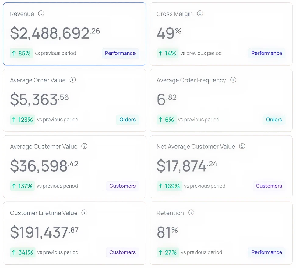 We've pre-built the analytics frameworks that drive growth for manufacturing and distribution businesses: customer lifetime value, retention risk, margin analysis, sales performance, and more.